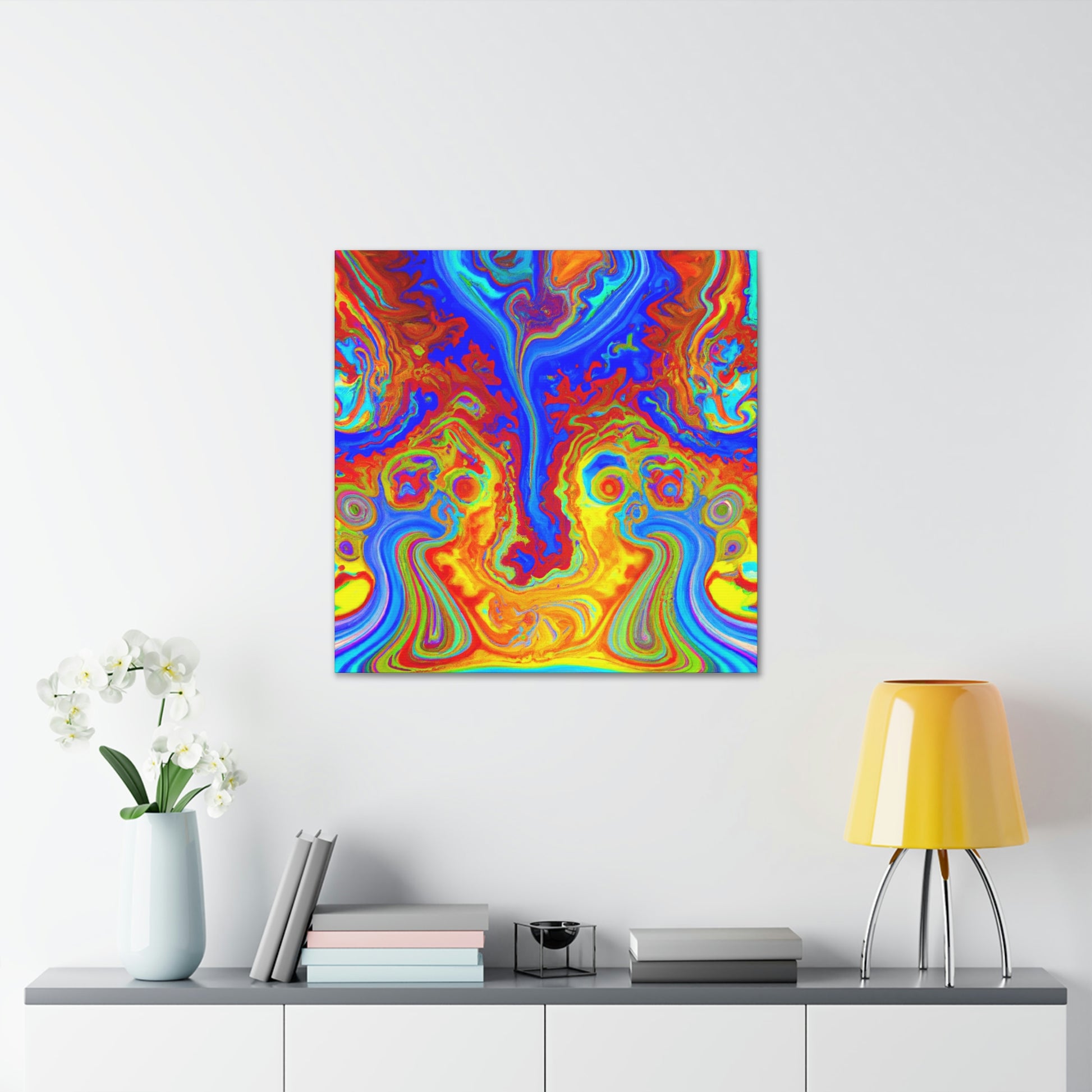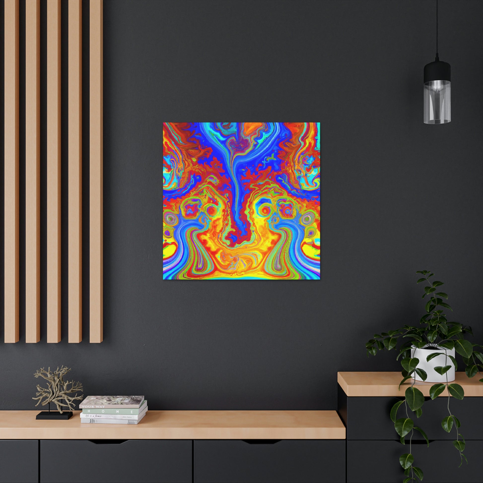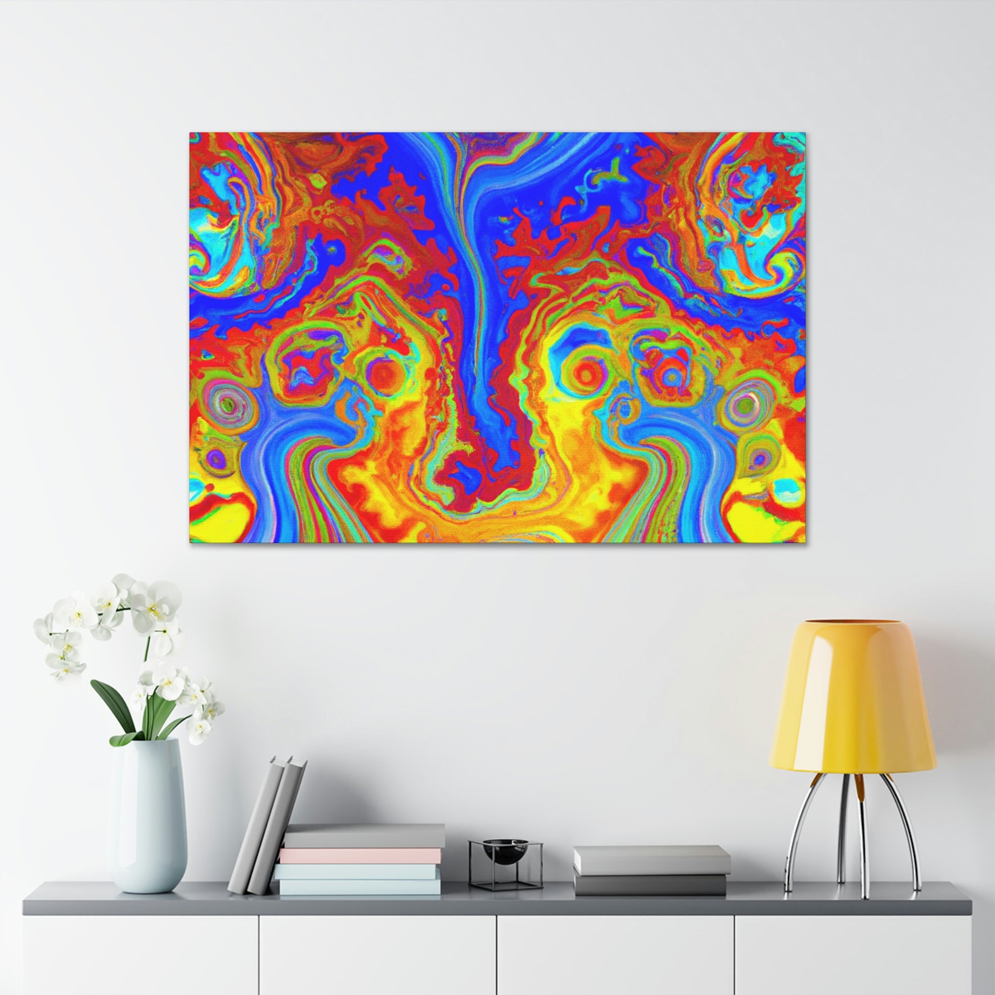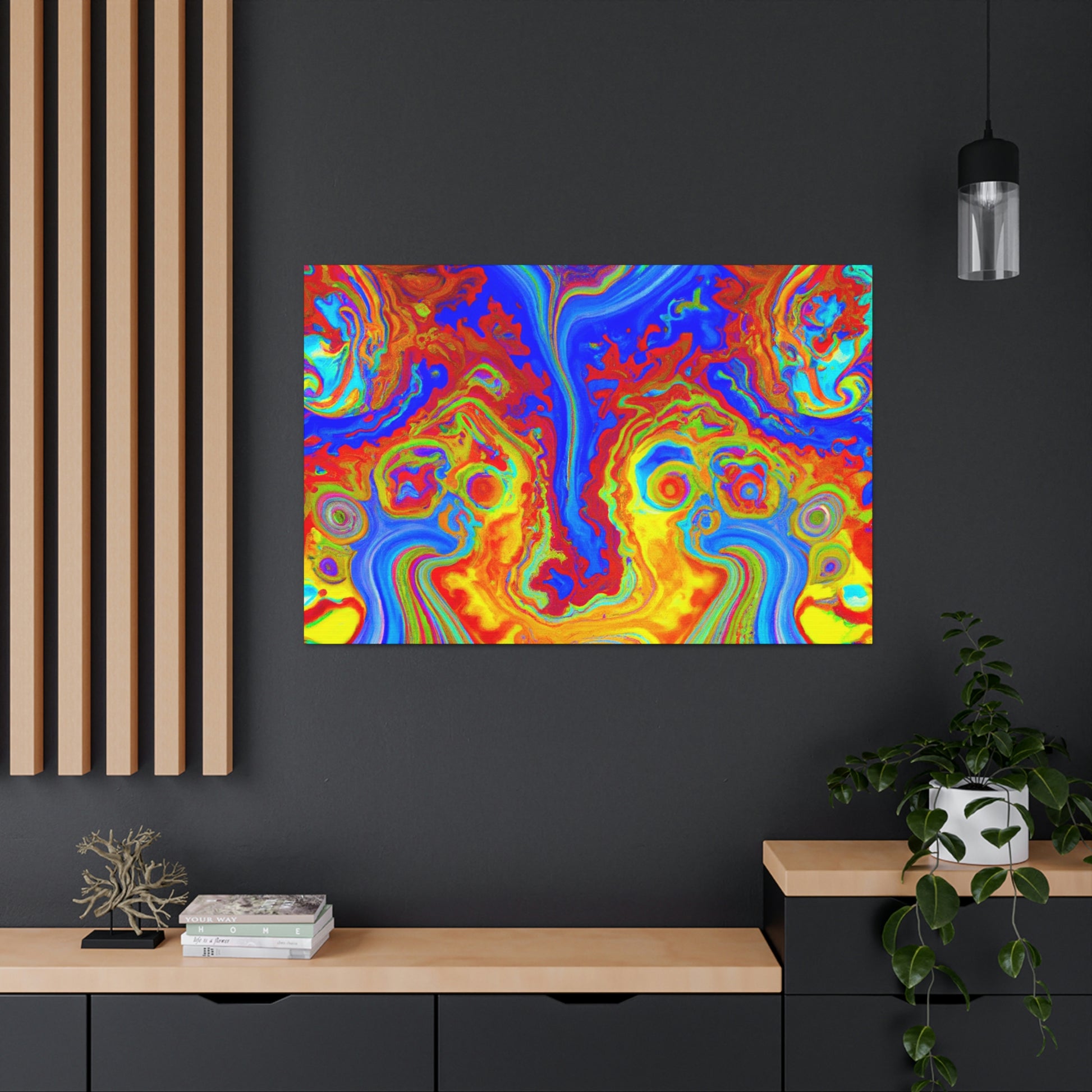 This vibrant and captivating canvas painting displays the bright colors and mesmerizing swirls of a psychedelic scene. The intense inks and blended hues combine to create a portrait reminiscent of the beauty of the natural world. Hang this painting in your home and enjoy its energy and charm each and every day. #psychedelic #painting #vibrant #captivating #hues #ink #blended #natural #beauty #charisma #energy